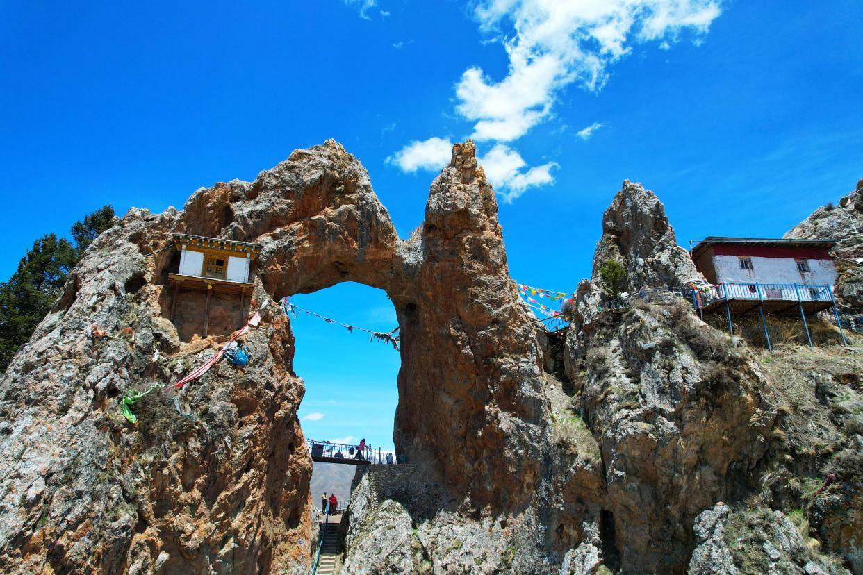想要看到孜珠寺的全貌,最好的方式就是航拍,孜珠寺一共有六座山峰,我们可以看到一个很经典的山峰,中间有一个很大的洞,这是孜珠山的第三峰,很多航拍爱好者喜欢用无人机从洞中穿越而过。