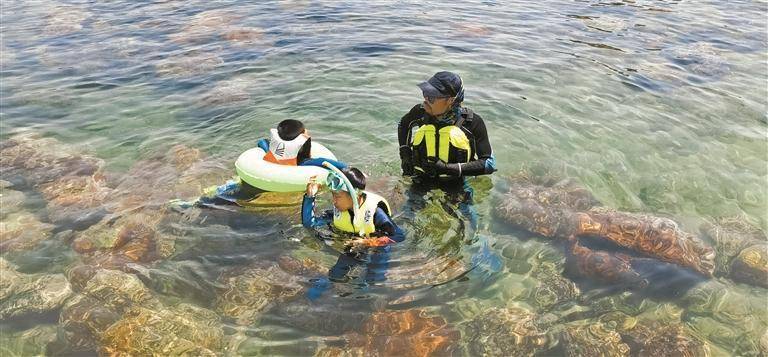 ▲情人岛附近海域,游客在学习浮潜。 深圳晚报记者 魏羽辰 摄