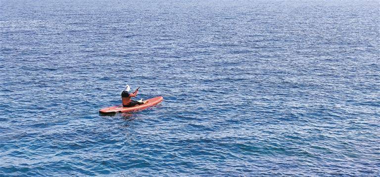 青洲岛附近海域,游客尝试桨板运动。 深圳晚报记者魏羽辰 摄