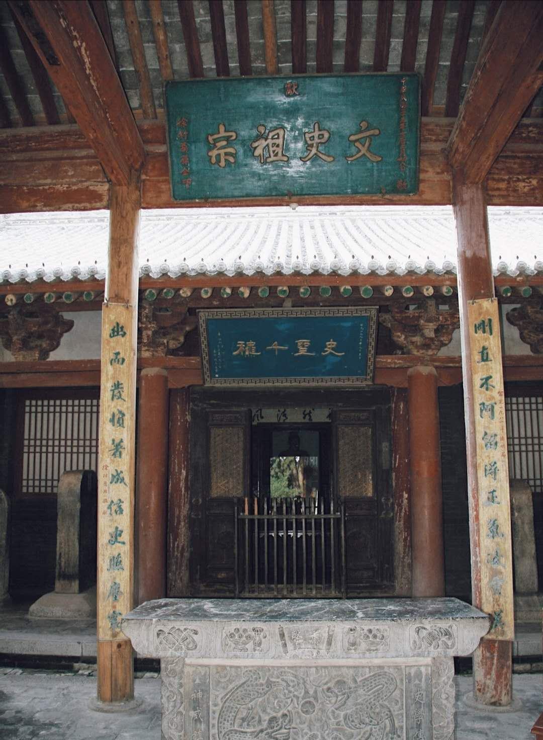 最后,在走过一条长长的台阶,小冰已经累得气喘吁吁,就是司马迁祠的第三道门“太史祠”。没错,这里就是此次旅行的终点站。进入太史祠,有一个两进的建筑。第一进是献殿,殿内匾额的写着“文史祖宗”,小冰认为这个评价名副其实;左右两边的梁柱有联,内容嘛小冰就不打啦,不要嫌弃小冰,因为这个字实在太难打啦。建筑的第二进是寝殿,有两块匾额,上面写着“史圣千秋”和“君子万年”,小冰觉得这是对司马迁一生最大的肯定。
