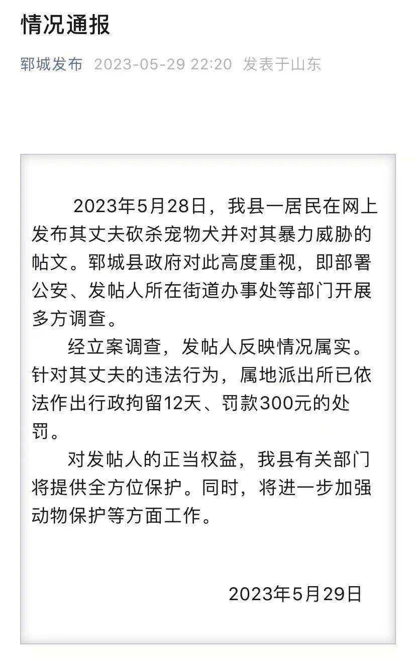 红星新闻网5月30日讯日前,一则山东男子砍杀宠物柯基犬威胁妻子的消息引发关注。5月29日,山东菏泽郓城县政府发布情况通报:情况属实,男子被依法行政拘留12天、罚款300元。内容如下:
