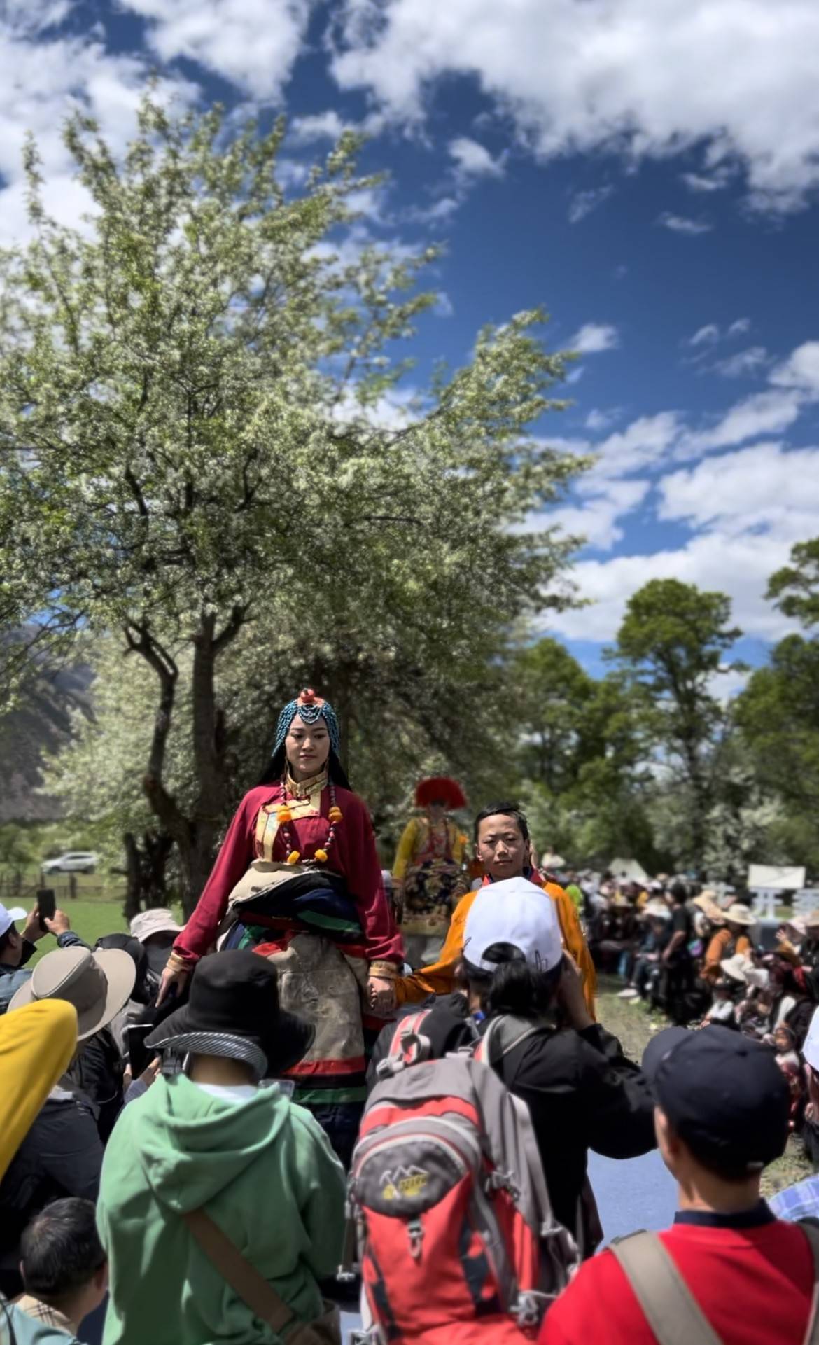 活动中,耄耋老人、总角孩童,在年轻的情侣、夫妻的陪伴下,身着极具特色的民族服饰,从田野间走过,身后洁白的海棠带来无限的浪漫和温馨,与这场别开生面的服装秀碰撞出各民族团结共荣,欣欣向荣的火花。