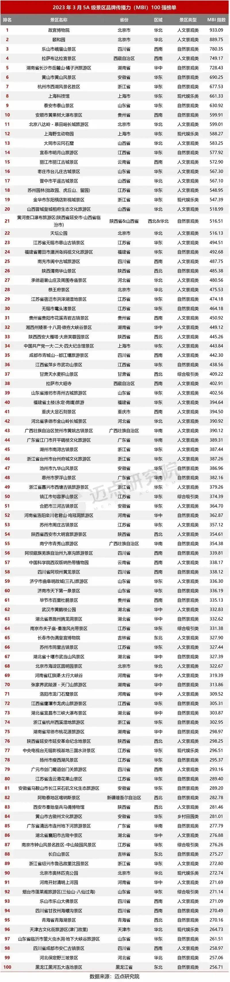 该榜单收录了截至2023年4月全国318家5A级景区,从搜索指数、评论指数、行动指数、媒体指数四个维度进行综合评价。