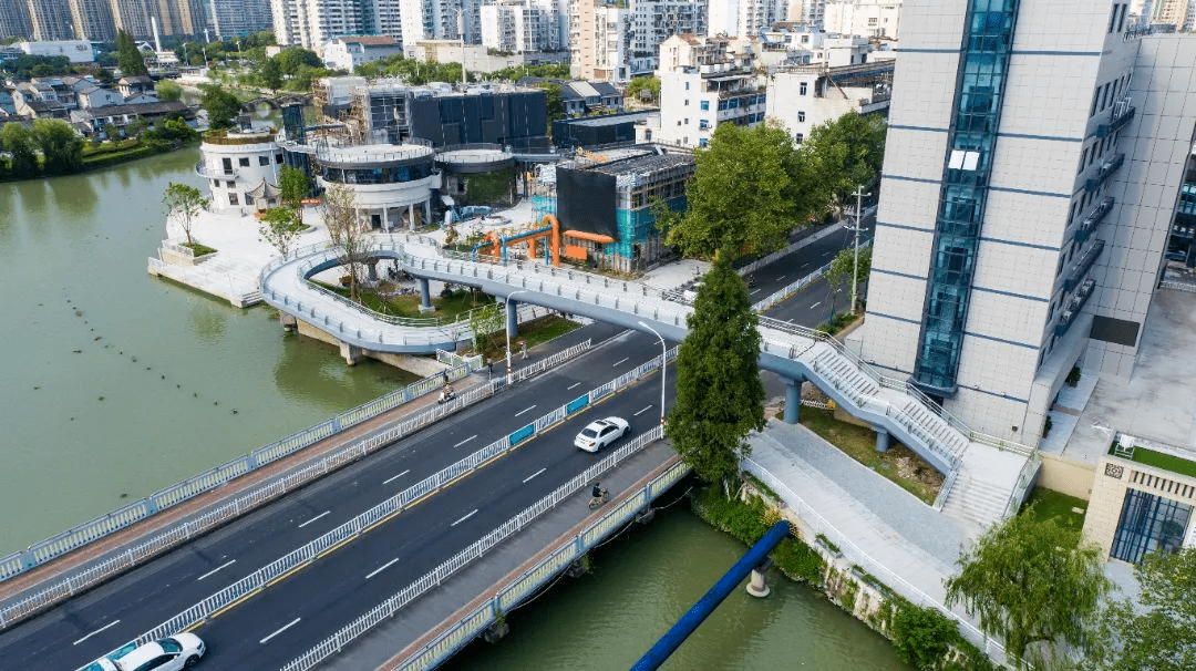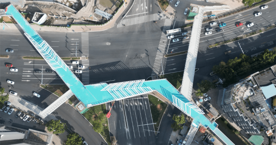 采用上、下层架空设计,配套廊架、防抛网等设施,具有“安全、快速、便捷”的人行景观功能。桥长1458米,宽4-14米不等,是集交通、绿道、观景为一体的城市空中廊道。