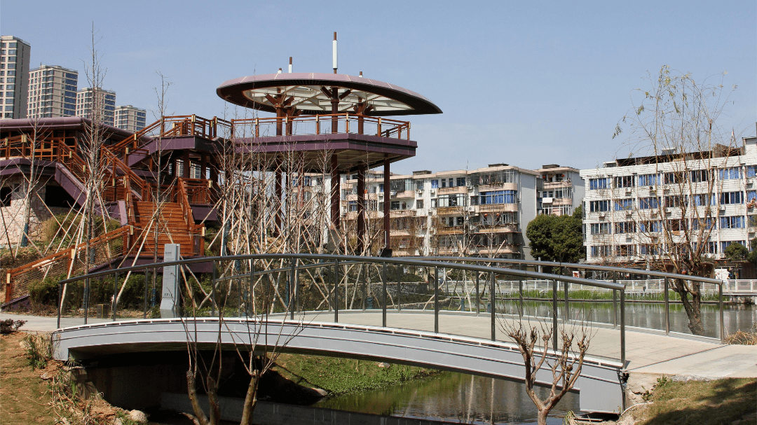 通过对原有的老桥进行改造利用,采用玻璃栏杆和花岗岩铺面,以平桥形式连通树屋、岛屿和岸边,达到无障碍要求,让老人、孩子享受到更多人性化的服务。