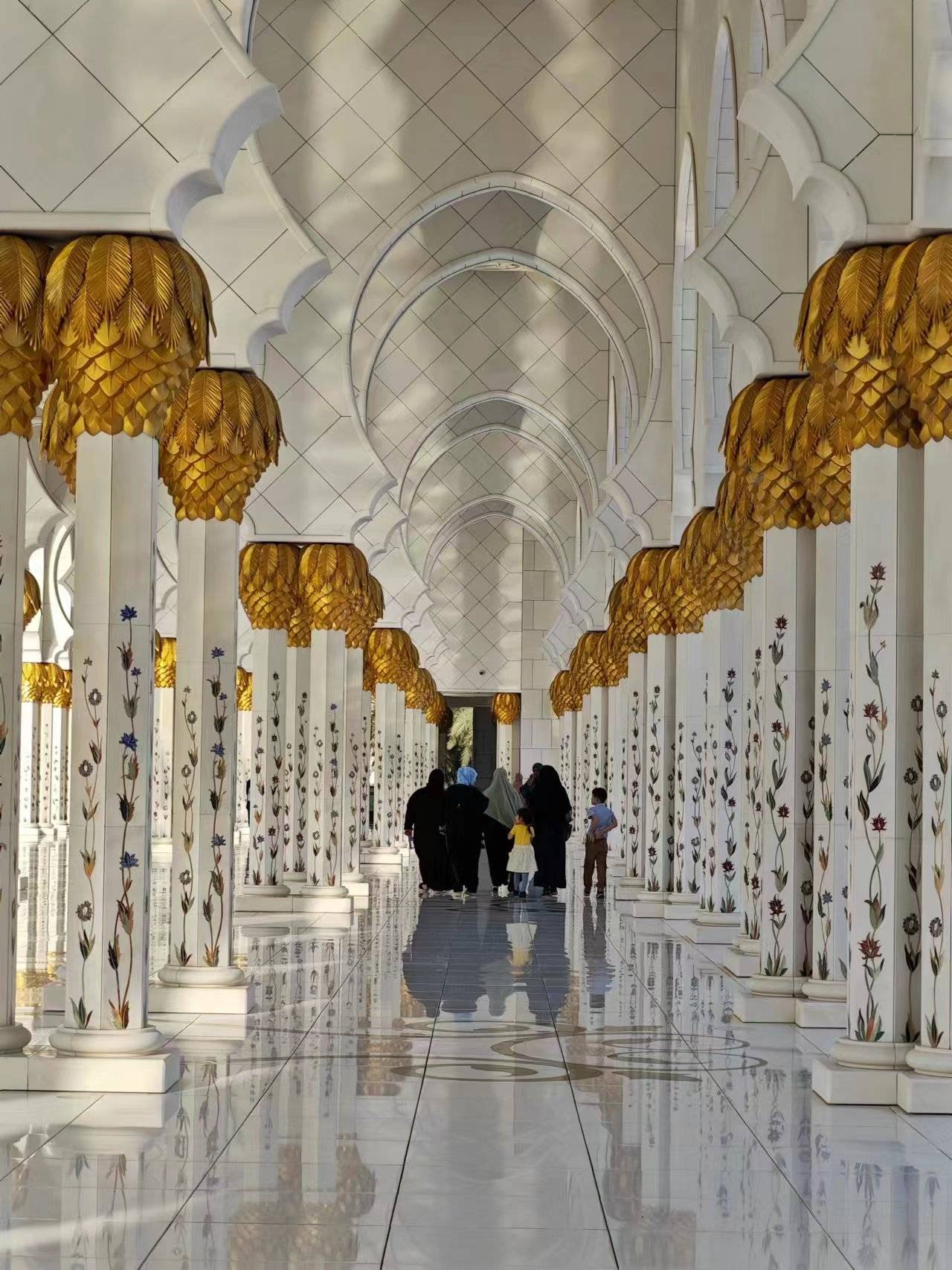 走进清真寺内,可谓步步惊叹、目不暇接。庞大的镀金施华洛士奇水晶吊灯炫丽夺目,重约12吨垂于穹顶;大量使用的白色大理石与金色细节完美交汇,沿途一根根镶嵌紫水晶和碧玉的立柱映现于倒影池中,颇为壮观;庭院中的巨型花卉图案被认为是全球最大的大理石马赛克艺术品;最值得看的还是手工编织的主祈祷大厅地毯,是吉尼斯世界纪录的全球最大手工地毯,由1200名工匠手工编织而成,你甚至看不到拼接的缝隙。