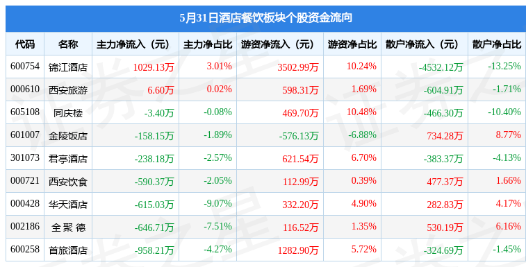 从资金流向上来看,当日酒店餐饮板块主力资金净流出2174.31万元,游资资金净流入6461.02万元,散户资金净流出4286.71万元。酒店餐饮板块个股资金流向见下表:
