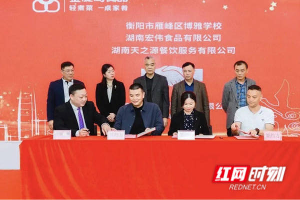 仪式现场举行了战略合作签署仪式,湖南金旋食品供应链有限公司与衡阳博超建材有限公司、湘潭博雅建材有限公司、河北千喜鹤饮食股份有限公司、衡阳市雁峰区博雅学校、湖南宏伟食品有限公司、湖南矢之源餐饮服务有限公司等6家单位达成战略合作伙伴关系,共同推进预制菜发展。