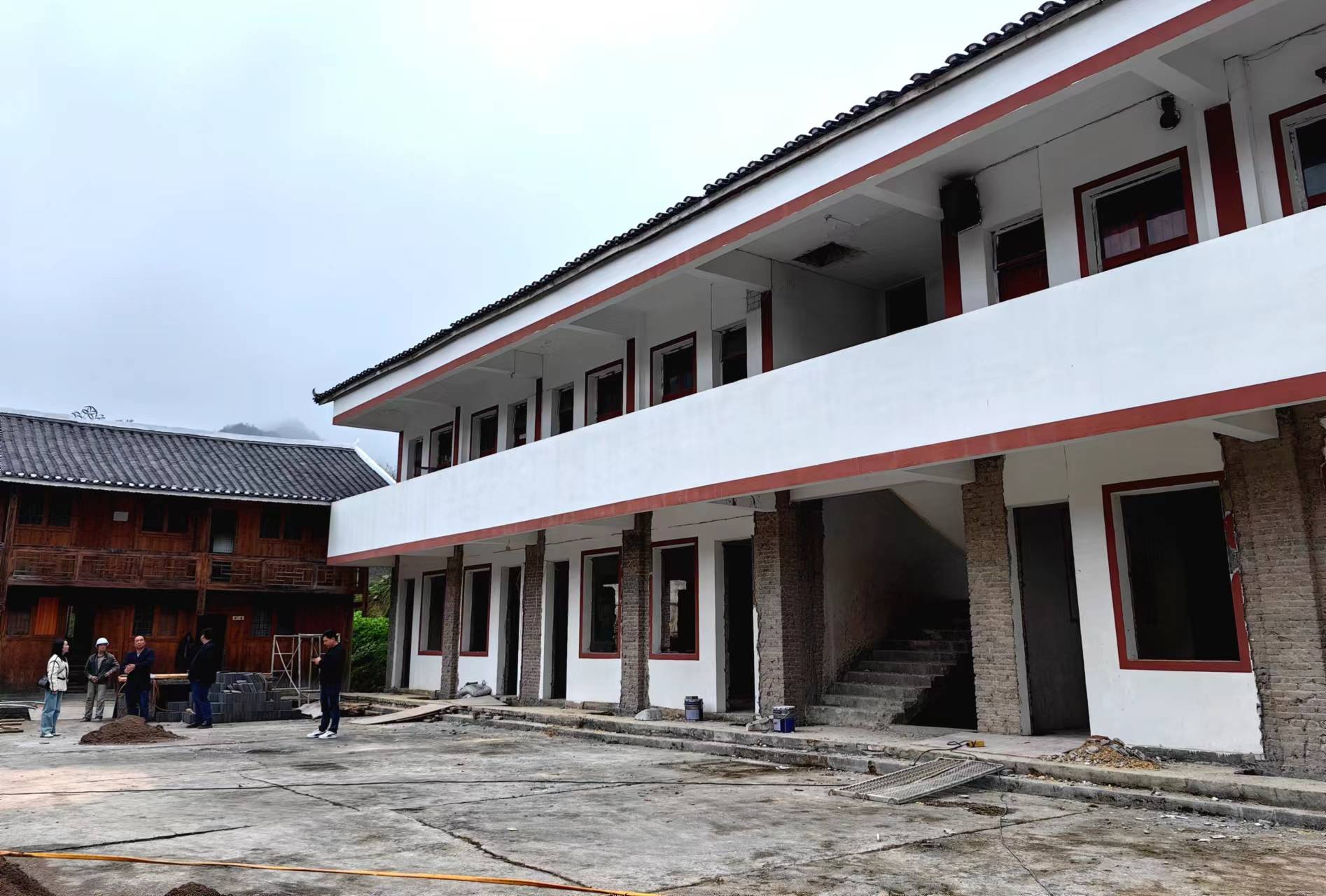 5月29日,记者在铜仁市印江自治县紫薇镇团龙村见到,闲置多年的村小学被改造为旅游民宿,工人正在装饰庭院做好开门营业的准备。