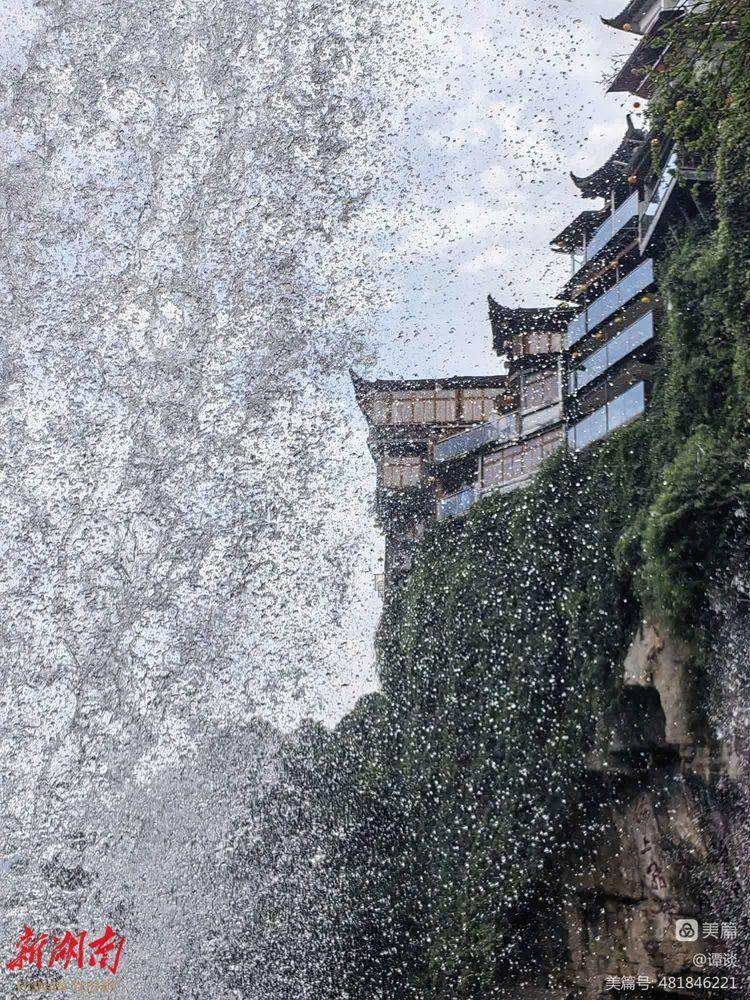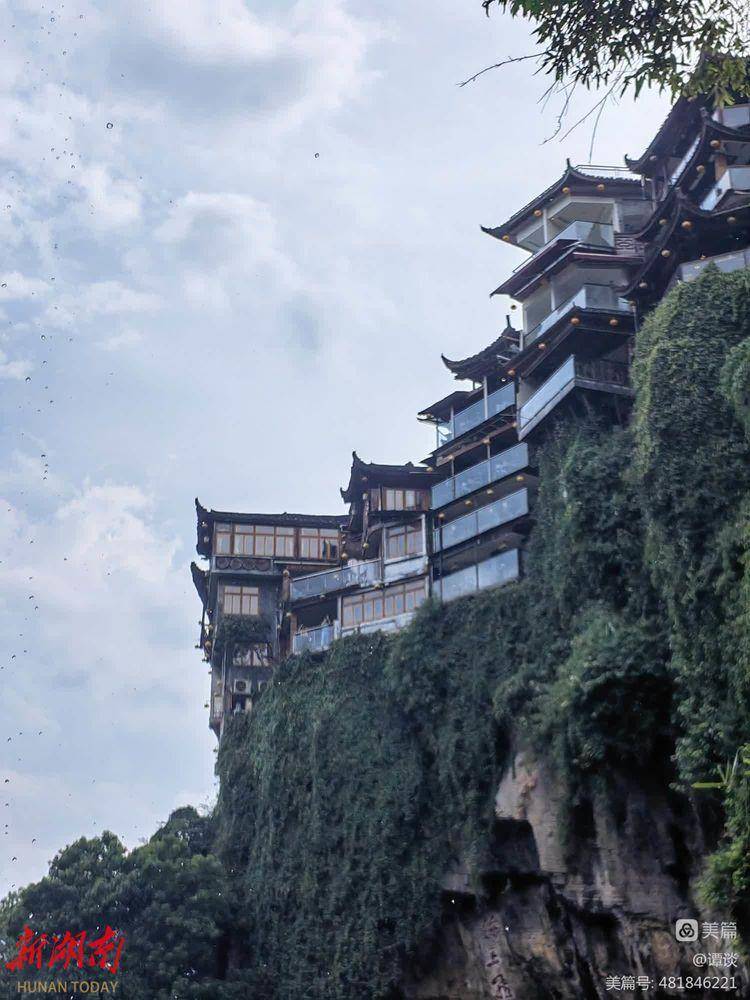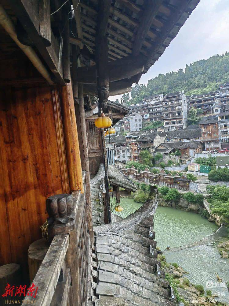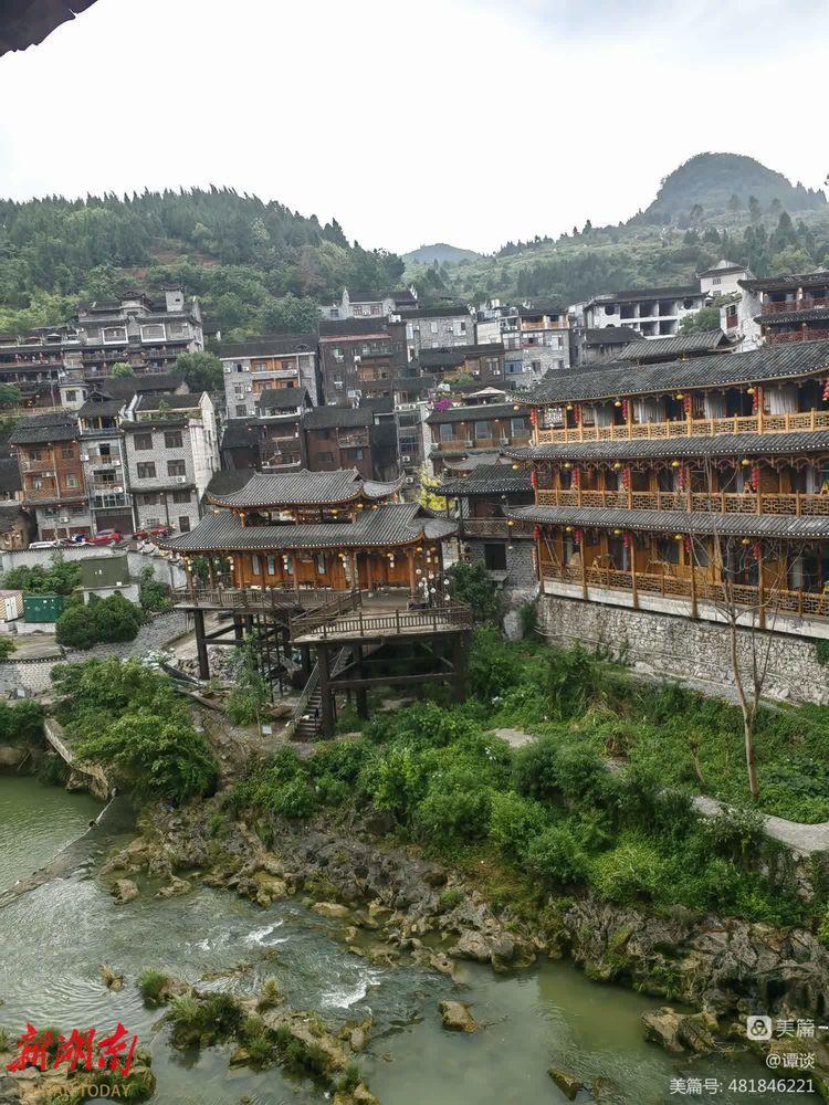 放下行李后,我走到卧室外的阳台上,举目远眺。心中就有一种冲动:啊,这里这么美呀!无论你朝哪一个方向看,都是一幅画,一幅惊艳无比的画!对面,一排排吊脚楼,紧贴着悬崖耸立,崖脚下,一挂溪水泻落。水面上,一排水泥墩子立在河心。一些游人正在跳墩过溪……我忍不住用手机,朝着不同的方向,连续拍了几张照片……