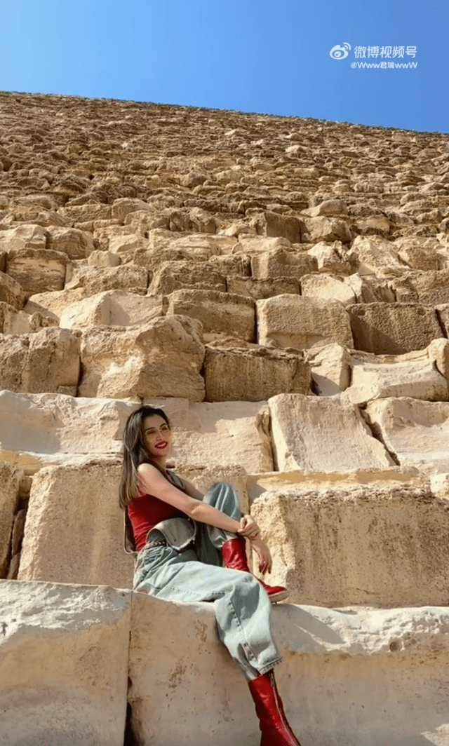 美丽的妻子王君瑞也来一张坐在金字塔塔基上的摆拍,美人,美景,美不胜收!