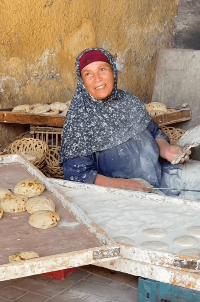 还遇到了一位埃及大妈正在烤埃及面包,热气腾腾,香气扑鼻。