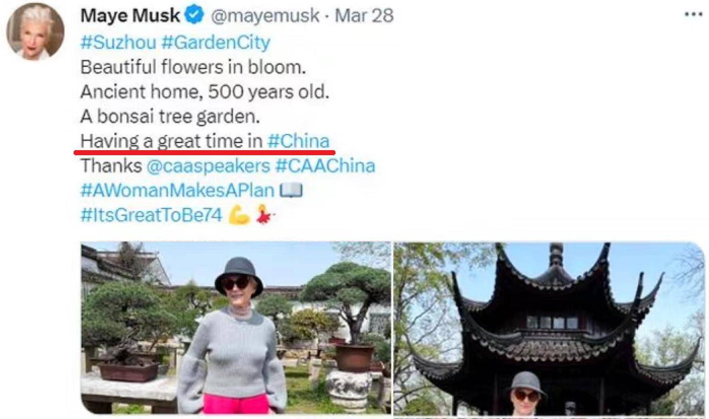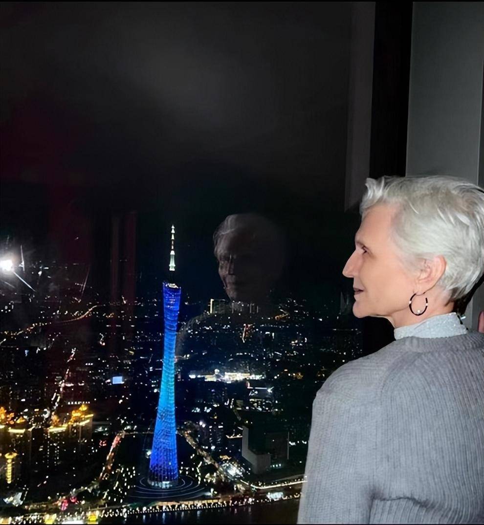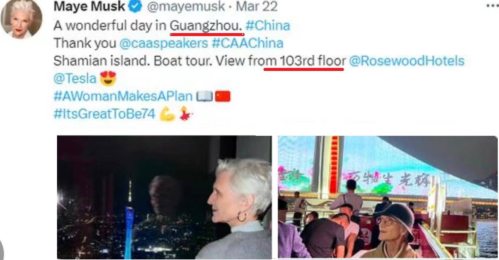 4月22日,马斯克的妈妈晒出一张造访设计之都广州的照片。夜里,他漫步在珠江边,站在天河CBD大厦的103层,眺望着金光闪闪的广州塔。