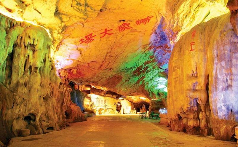 入口在中洞,进去后有一个天然的狮象广场,面积达千余平方米,高达七米的石笋伫立洞口,名曰砥柱峰。广场上面挂满了钟乳石,两侧屹立着一对形似青狮、白象的天然巨石,形态逼真,惟妙惟肖。