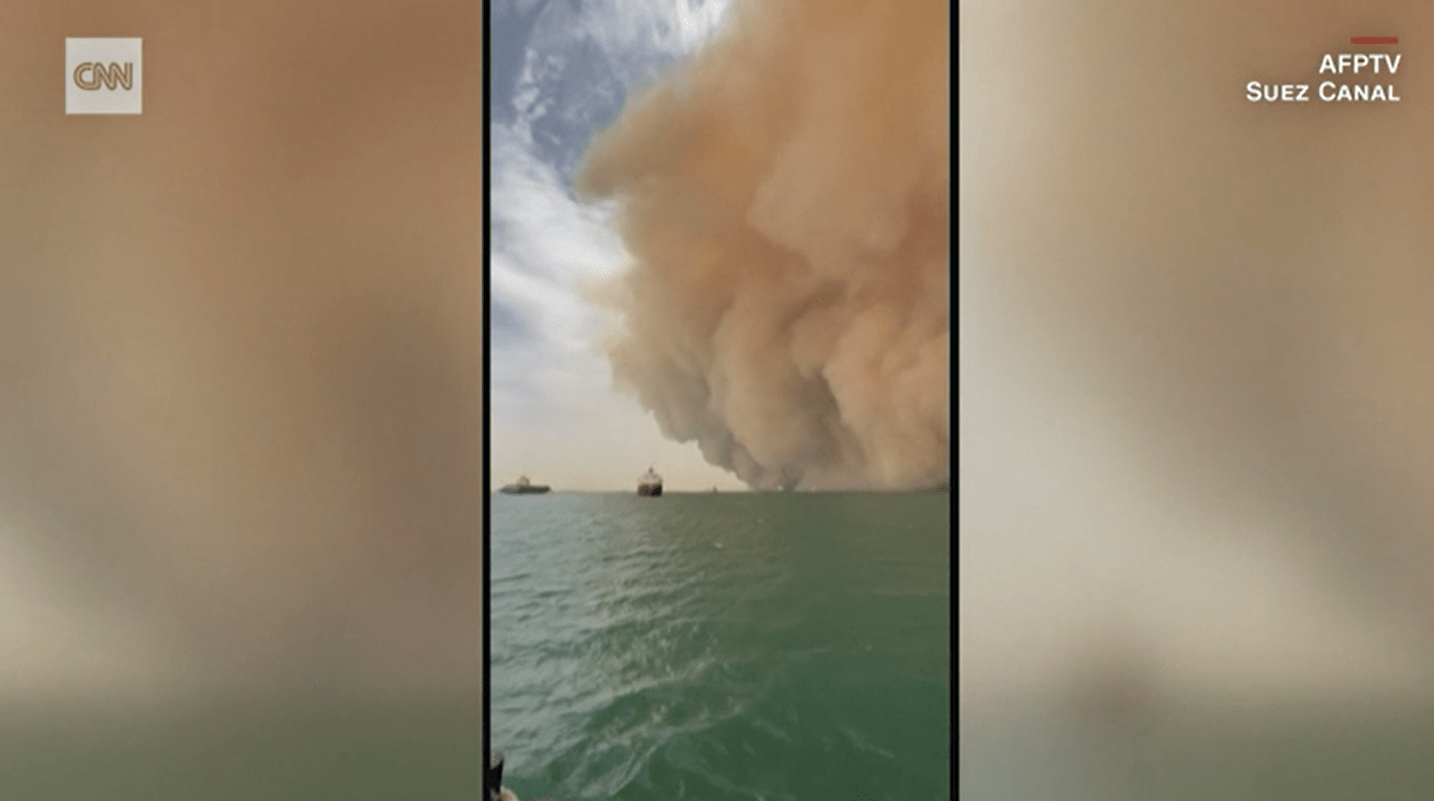 另据CNN报道,视频显示,1日的沙尘暴席卷了苏伊士运河,天空逐渐被黄沙笼罩。