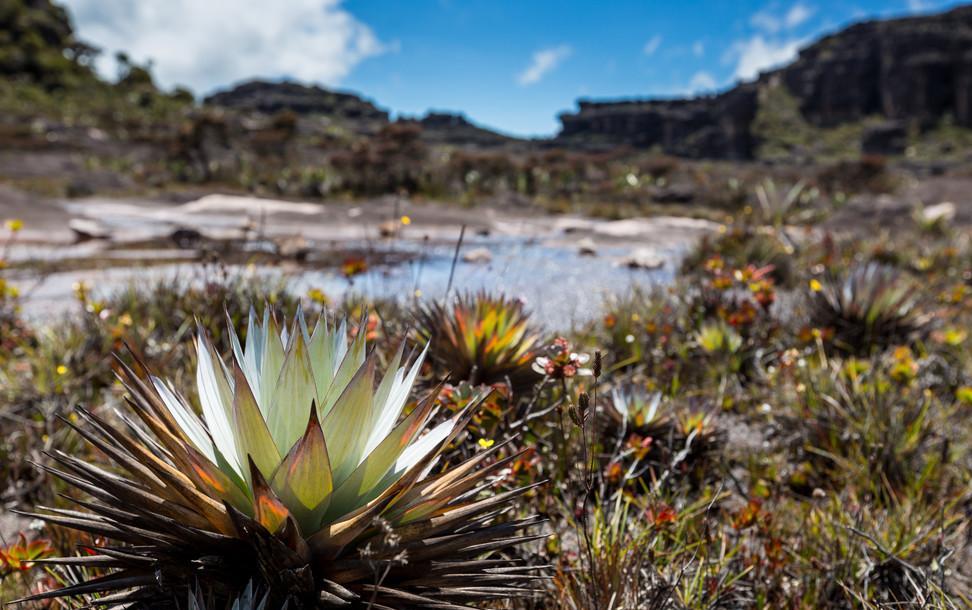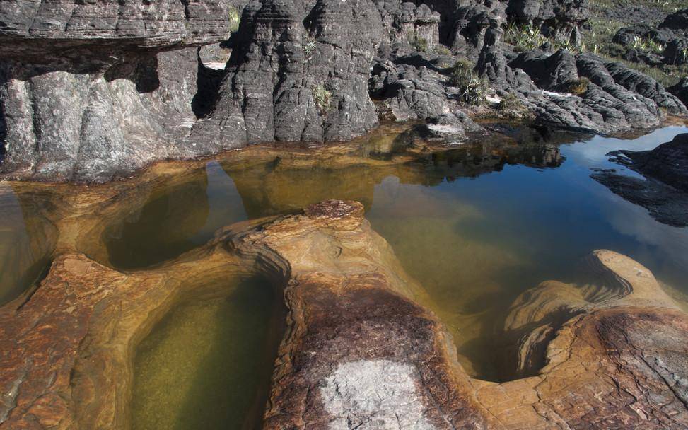 在远方看着整个山体非常平,但其实靠近它就会发现,它是一个崎岖不平的状态,是经过多年的一个自然环境腐蚀而形成的自然现象,在罗赖马山顶部岩石上还留有一些水波纹,阳光照射在上面,有点像形状各异的水晶被人撒在这里,上面还有一个天池,里面都是纯天然的水,被誉为天然浴池,虽然山上面水温很低,但是依然有当地人会特意来到这里洗浴。