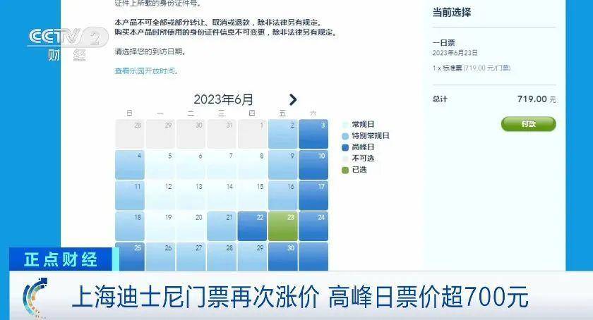 记者在上海迪士尼官方网站上看到,6月23日的票价为719元,比同样是高峰日的6月22日的票价贵了60元。这也是自2016年上海迪士尼度假区正式开园以来,门票价格第4次上调。此次,常规日、特别常规日、高峰日、特别高峰日分别涨至475元、599元、719元以及799元,较现行票价上涨30元到60元不等。