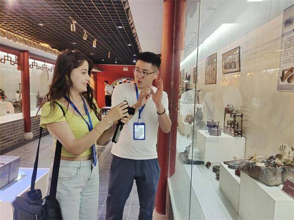 工作人员向来自土耳其的娜丝丽介绍乌拉鞋 摄影 杨薇