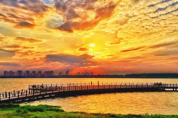 上图:湖北省荆门市代管的县级市钟祥市区内的莫愁湖霞光满天的美景。