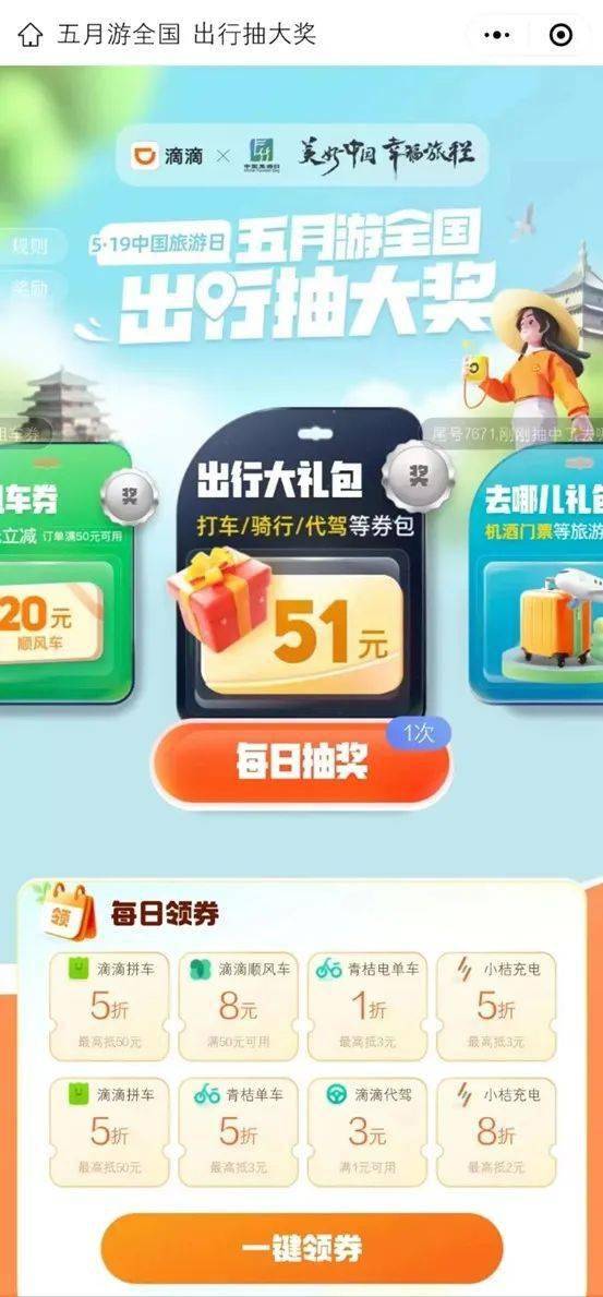 百万疆域的“5·19”活动中,高德地图、滴滴出行开展2亿元优惠补贴的“出行有礼”活动,铁路12306APP、京东商城、工银e生活开设“中国旅游日·中国礼物”推介专区,引起广泛关注。支付宝除发布7款专属城市出行皮肤码外,还在全国200余家旅游景区投放主题物料,触达超1亿人次。