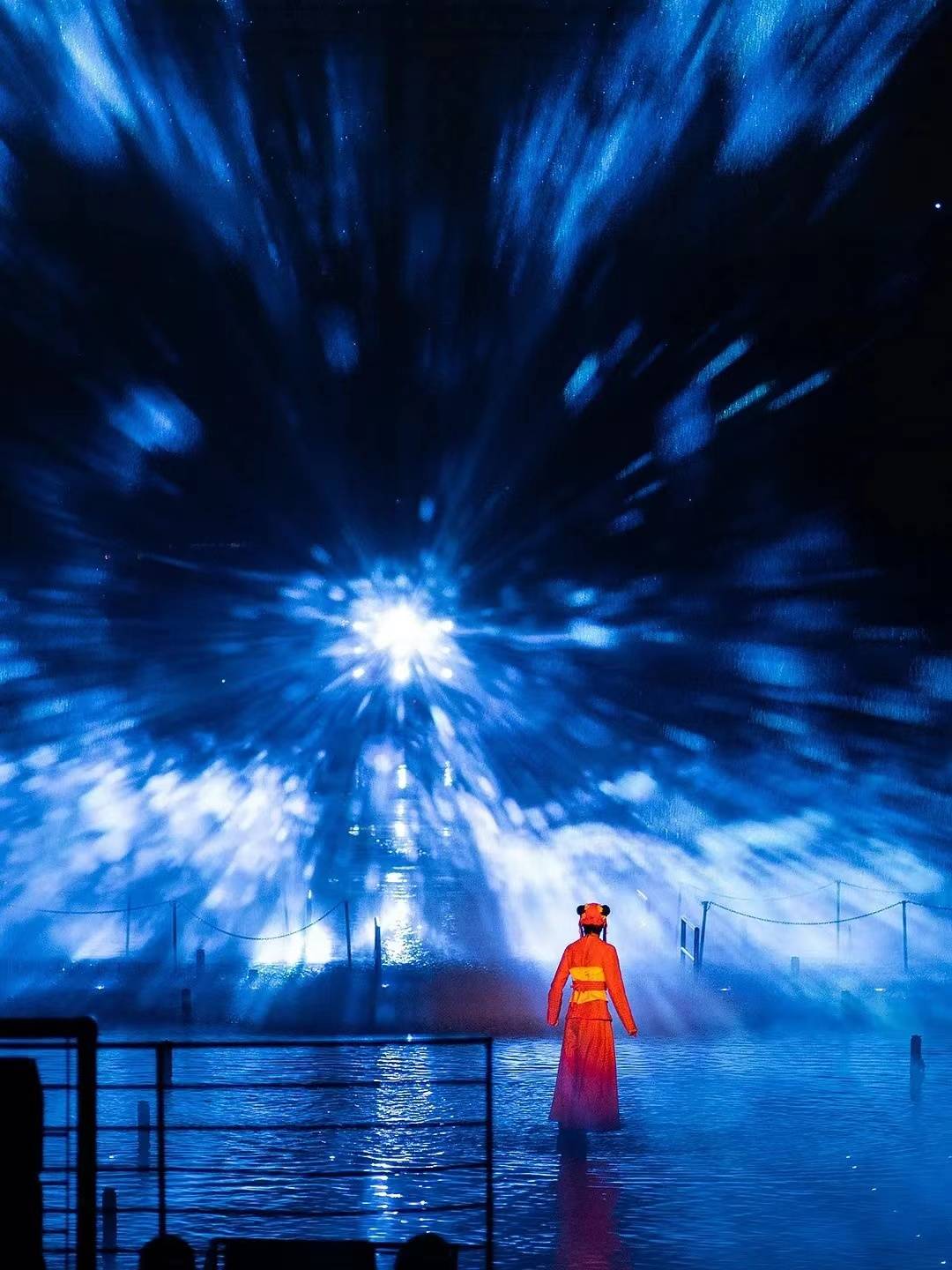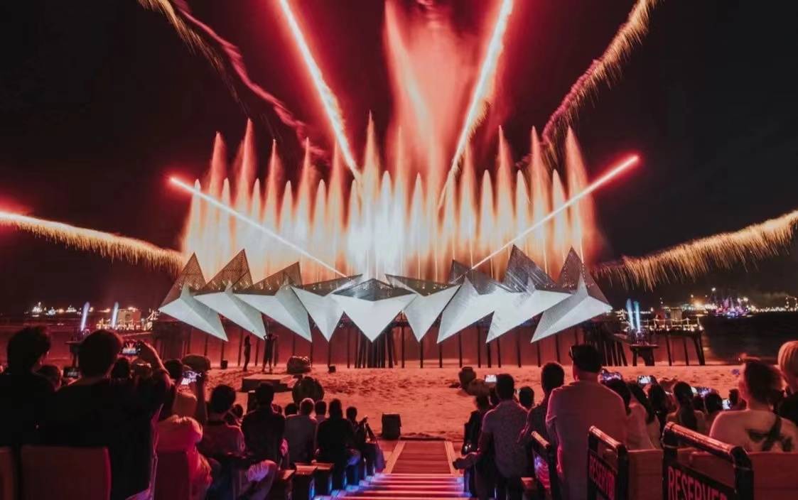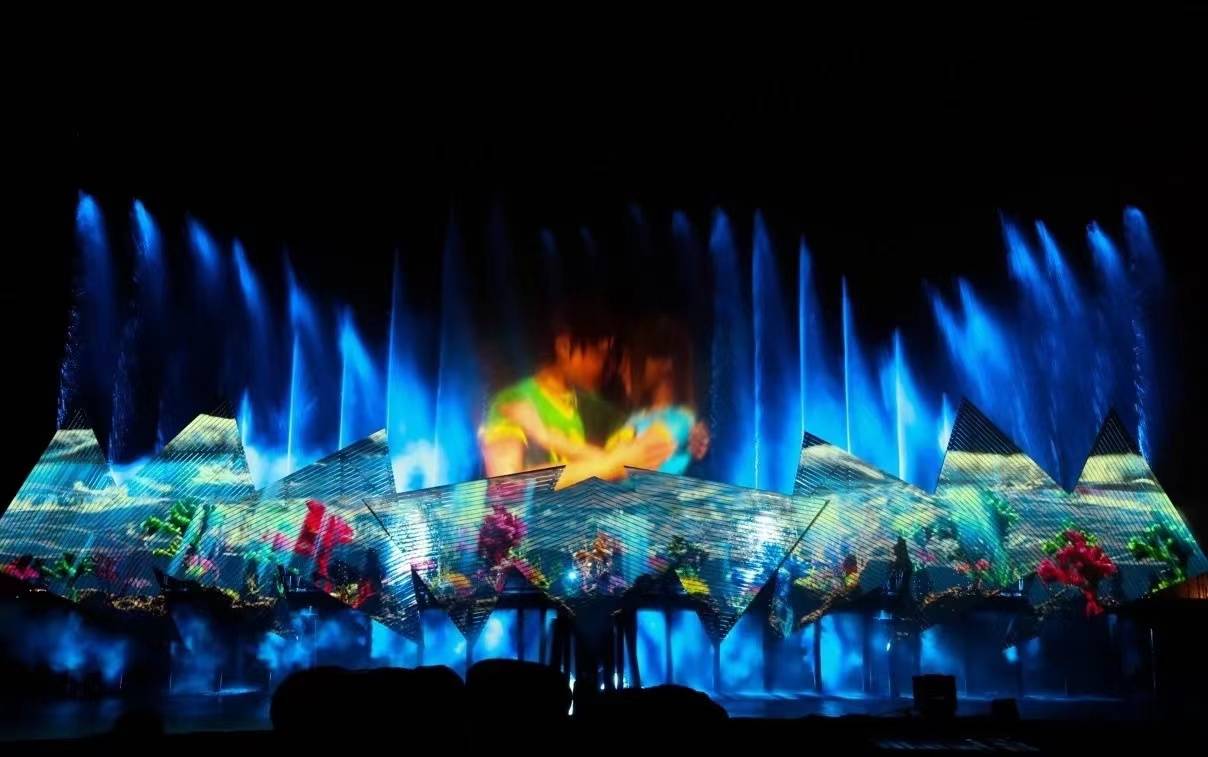 全息水幕投影,也叫水幕灯光秀,是一种利用全息技术与水幕特效相结合的新型水舞台艺术表现形式。水幕灯光秀以水为载体,运用了3D全息投影技术、激光技术、视频处理技术等多项科技手段,呈现出绚丽的视觉效果。其创意来源为水面上的涟漪和水花。水幕灯光秀以其独特的创意与震撼的视觉效果征服了观众。