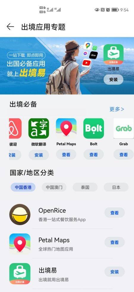 为了给用户提供更多元化的出行服务,华为应用市场推出了境外应用专题卡片,境外常用App都可以轻松找到,而且在到达目的地后,首次打开,系统还会智能推荐当地热门应用,一键下载,省时省心。
