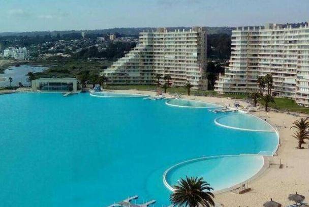 第一个世界最大的泳池就是智利的阿尔加罗沃泳池,它可以容纳小型船只航行,被吉尼斯世界纪录认证为世界上最大的游泳池。阿尔加罗沃泳池光建设就用了5年的时间,耗资更是有10亿英镑,长1013米,总面积有8万平方米,相当于有11个足球场那么大!更不可思议的是它每年的维修成本费用高达200万英镑。它的设计者费什曼的说过,这一技术含量极高的工程的顺利竣工,意味着他的公司即使在那些不适合人类居住的地方也能够打造出“一个感人至深的人造天堂”。只要能够获得取之不竭的海水,就可以让这种游泳池正常运转起来,同时它还不会对海洋造成任何伤害。