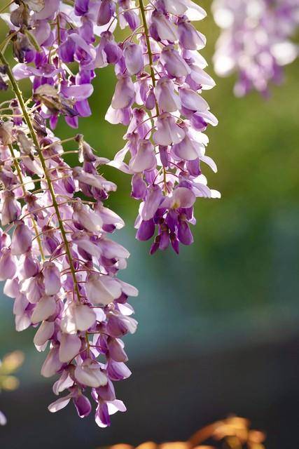 微风吹拂下,紫藤萝花在春风中微微颤抖,摇摇晃晃,仿佛听到了奔腾的流水声;风稍微大了一点,花儿相互碰撞,花瓣纷纷落下,仿佛落在溪流里。溅起的水花,如梦如幻,气氛十足。