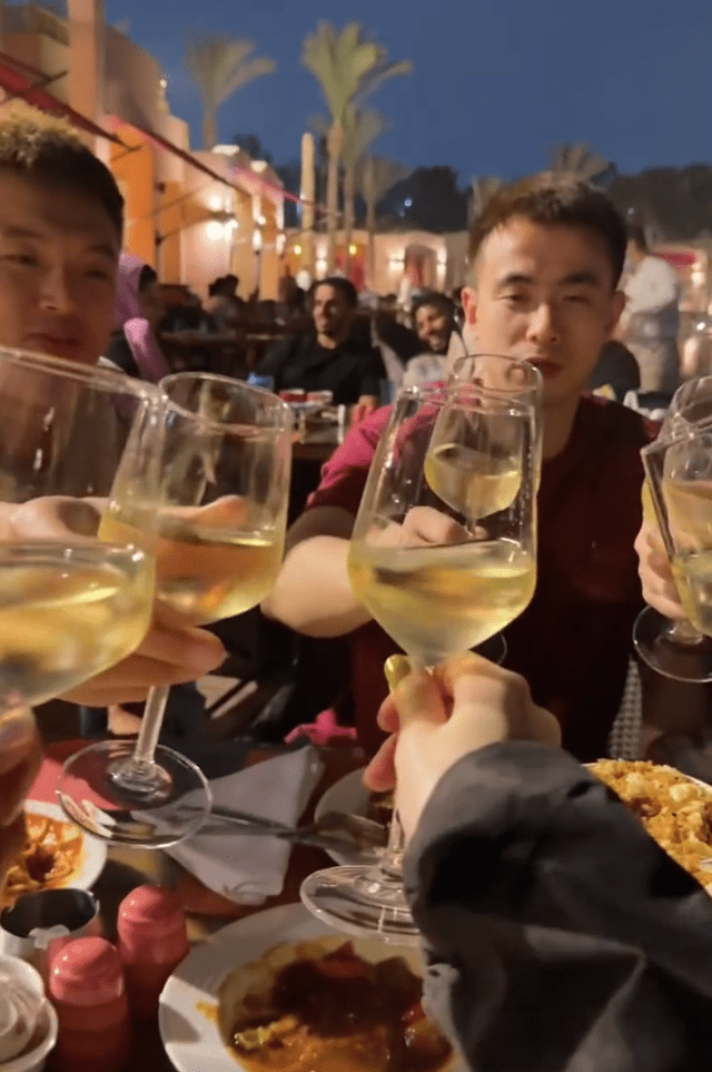 赵继伟和朋友们一起干杯,享受埃及当地的美食。