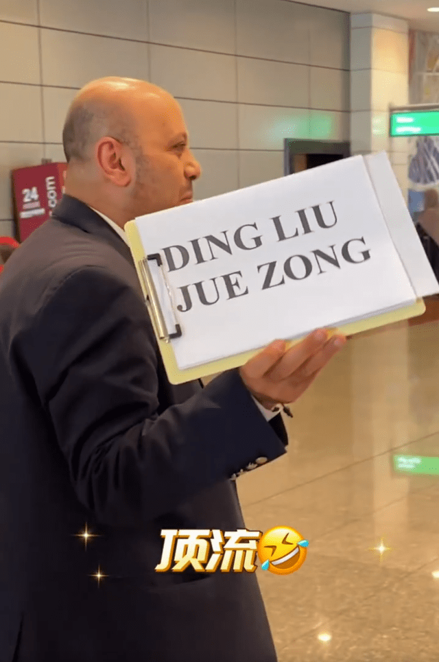 接机的埃及旅游工作人员打出了“顶流”的字幕,欢迎赵继伟一行的到来,其实应该是赵继伟朋友的名字Liu Ding。