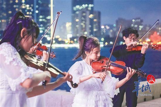 行至天色的“蓝调时刻”,奥帆中心情人坝上,弦乐奏响浮山湾。来自艺术快闪的悠扬琴声,为一水相隔的城市灯光秀伴奏和鸣。