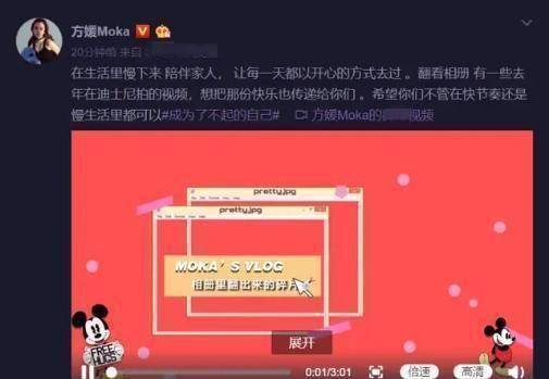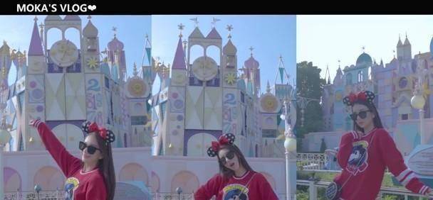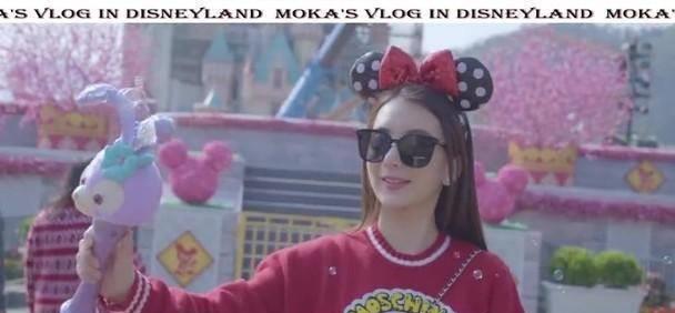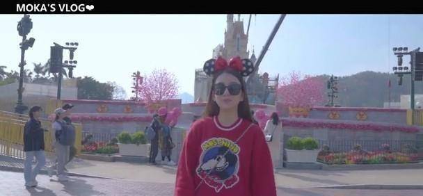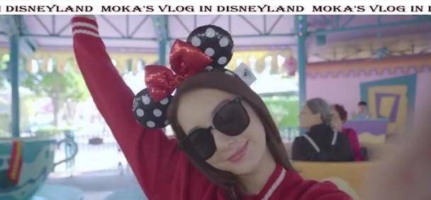 视频中的方媛戴着米奇头箍与墨镜,穿着大红色的米奇卫衣,