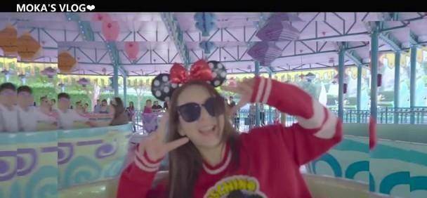 她在迪士尼公园里玩旋转木马、咖啡杯等游戏,