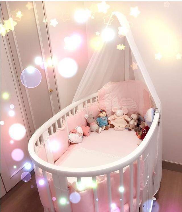 儿童房里放着一张白色的BB床,床上铺着厚厚的粉色软垫,还放着许多布娃娃: