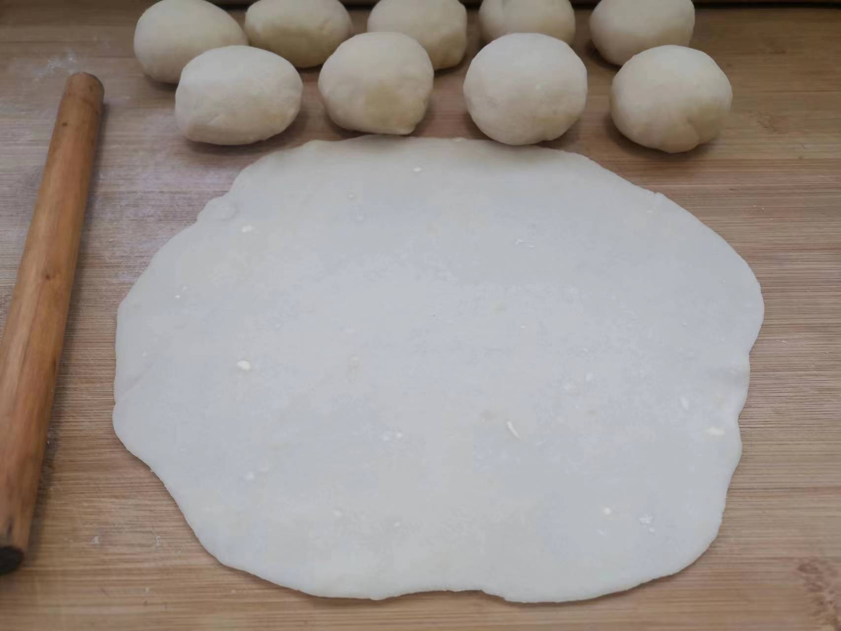 4、 我们把面团分成数个剂子,揉圆之后放到一旁,取一个小面团擀成大圆片,面片大小根据蒸锅口径大小来定。