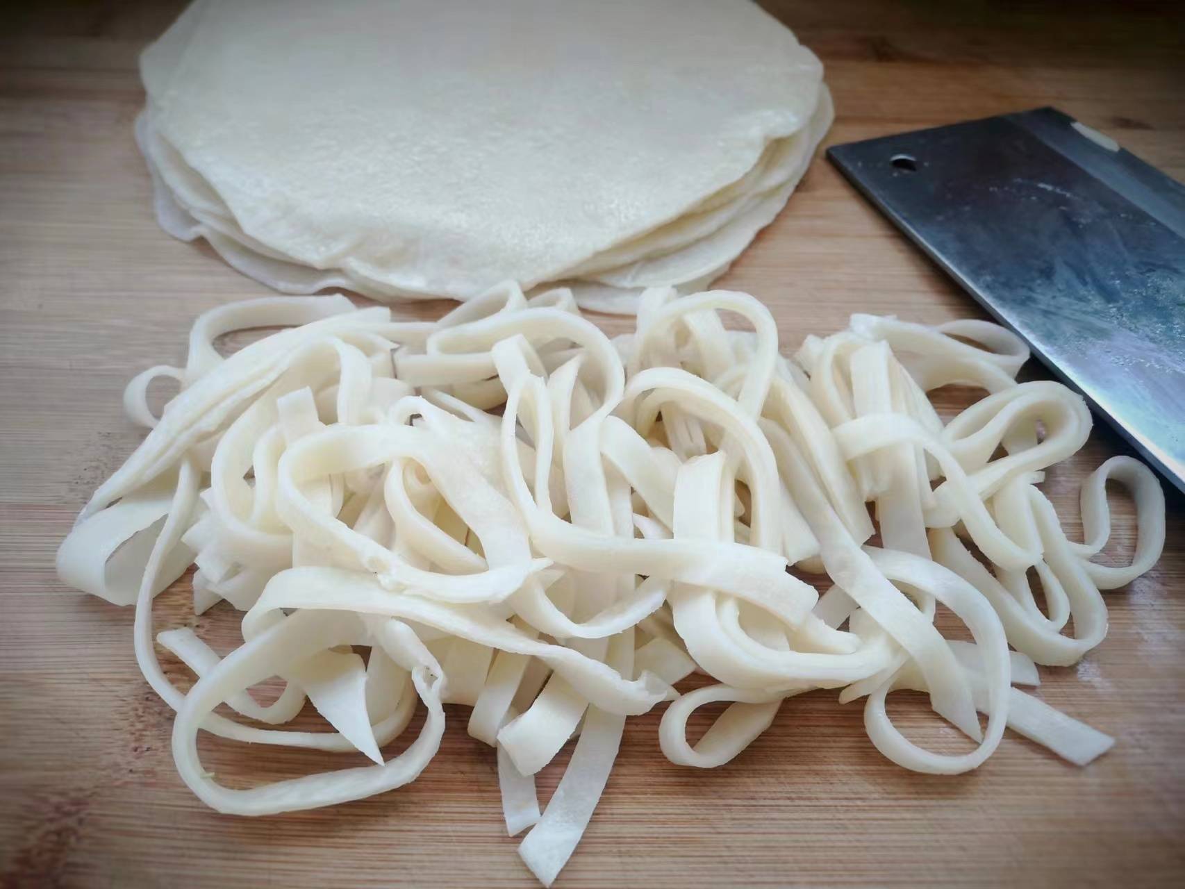 7、这样做的凉皮,筋道柔软而且还有韧性,我们叠起来之后,将面皮切成条,然后装到盘子中。