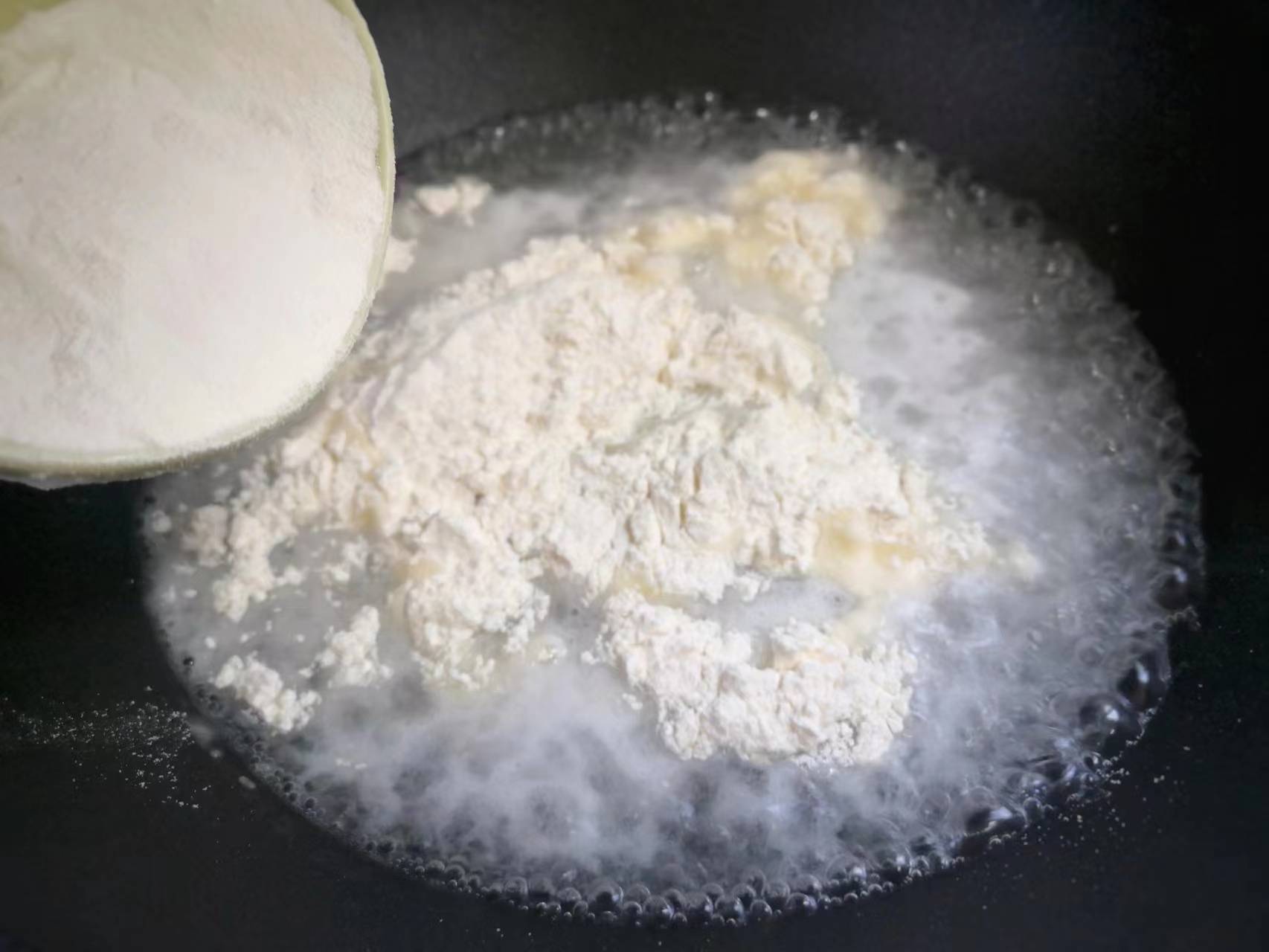 1、锅中倒入适量清水烧开,放入适量盐,火开最小,将一碗面粉倒入锅中,边倒边用筷子搅拌,比例大概是一斤面粉,二斤水。