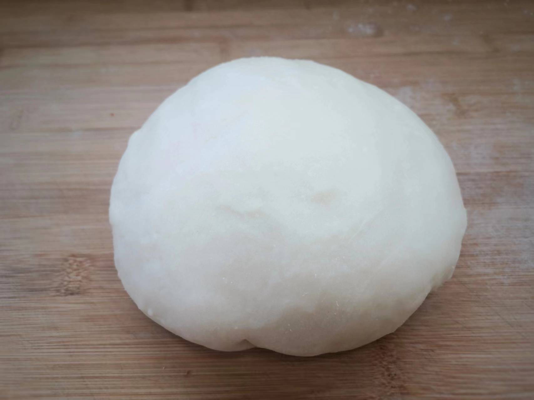 3、然后把烫好的面团取出来,放案板上,撒点面粉然后揉在一起,揉光滑。