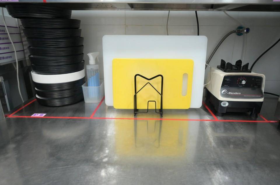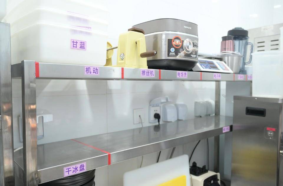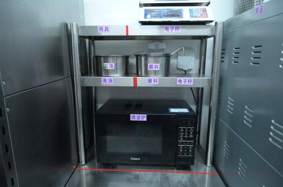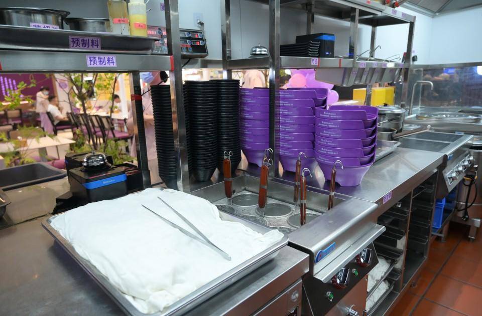 在过桥缘·过桥米线恒隆广场店,就餐时间刚过不久,店内的工作人员已经把门店里里外外打扫了一遍,后厨操作台擦得一尘不染。操作间的置物架上,所有的工具、调味料等都摆放在了各自的位置,一些需要冷藏的原材料也放进了冰箱冷藏。