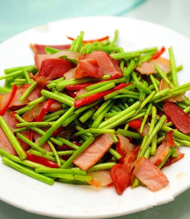 藜蒿炒腊肉以其“脆嫩爽口,醇香柔润”的特点。在所有蔬菜与腊肉的组合中,要数藜蒿达到了最高境界。咸香柔软的腊肉,配上藜蒿独特的淡香。吃上一口,唇齿生香,回味无穷。也难怪上至宾馆酒楼,下至酒家排档家庭餐桌,都少不了它的身影。招待外地朋友,藜蒿炒腊肉也成了首选,是必备的一道压轴菜。