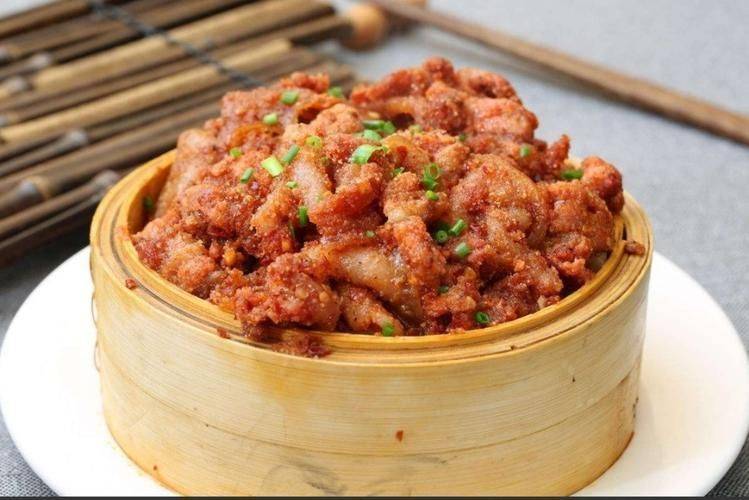 形式,一笼床粉蒸肉有近桌子大,十分霸道。在江西米粉肉除了粉蒸肉,还有香椿粉鲊肉,粉糊肉,粉煎肉,粉薰肉,粉晒肉,粉酥肉,粉炒肉和粉烧肉等。