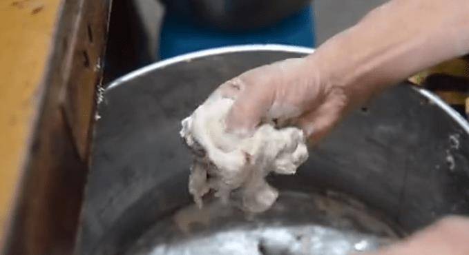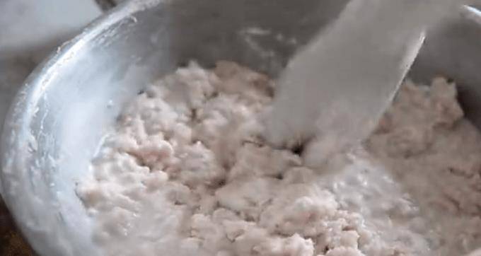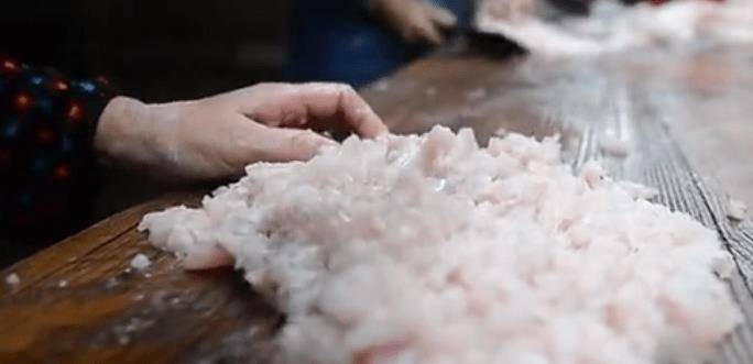 4、将切好的鱼肉放在木板上,用手揉几下,直至呈泥状。也叫鱼泥,因为鳗鱼的肉一定和泥一样好吃。然后将鱼泥放入盆中备用。