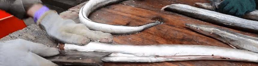 2.准备一些新鲜的鳗鱼,洗净。事实上,制作鱼丸时比较有问题的步骤之一是加工鱼。比如鳗鱼的处理就比较专业。必须去除头部和内脏。清洗后,必须去除表面的皮层,只留下里面柔软的果肉。
