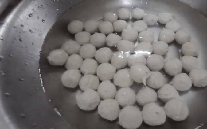 这里补充说明一下,准备好的盛清水的容器,不仅是用来给原本成型的鱼丸定型的,也是为了防止做好的鱼丸相互粘连。