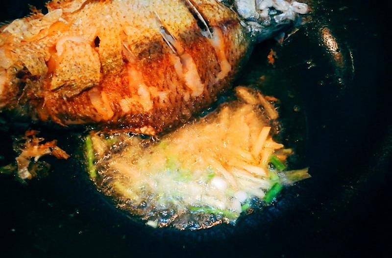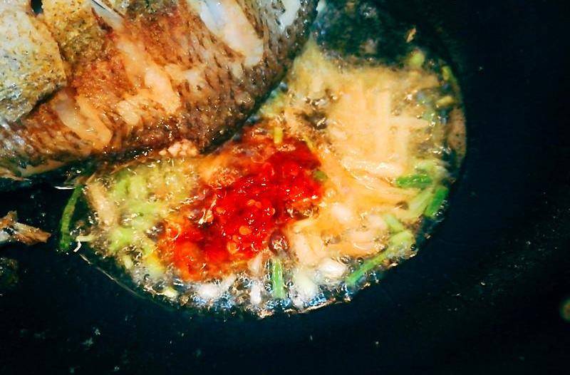 3、鱼煎好之后,加入生姜、大蒜炒出香味,再加入湖南特色剁椒酱和生姜、大蒜翻炒均匀。