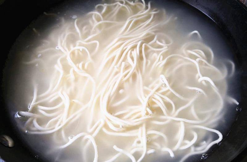 1. 锅里放入适量清水,加一点盐,水烧开后,把面条放进去,煮至5分熟,