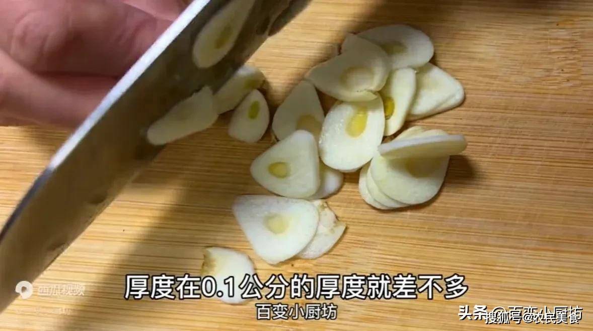 待客都非常的有面子,做法也非常的简单,准备几瓣大蒜,把大蒜切成薄片,这里也不用切的太薄,厚度在0.1公分的厚度就差不多,切的太薄的话吃起来口感没那么好,切的太厚又不容易入味。