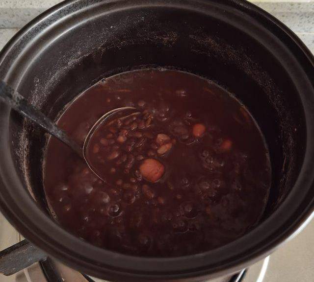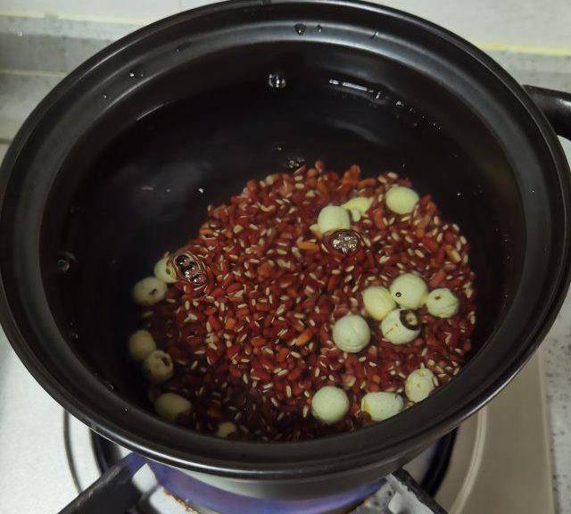 第5步、锅中烧水,凉水将浸泡的赤小豆和莲子放进锅里中小火煮一小时,中间要用勺子不停的搅动。