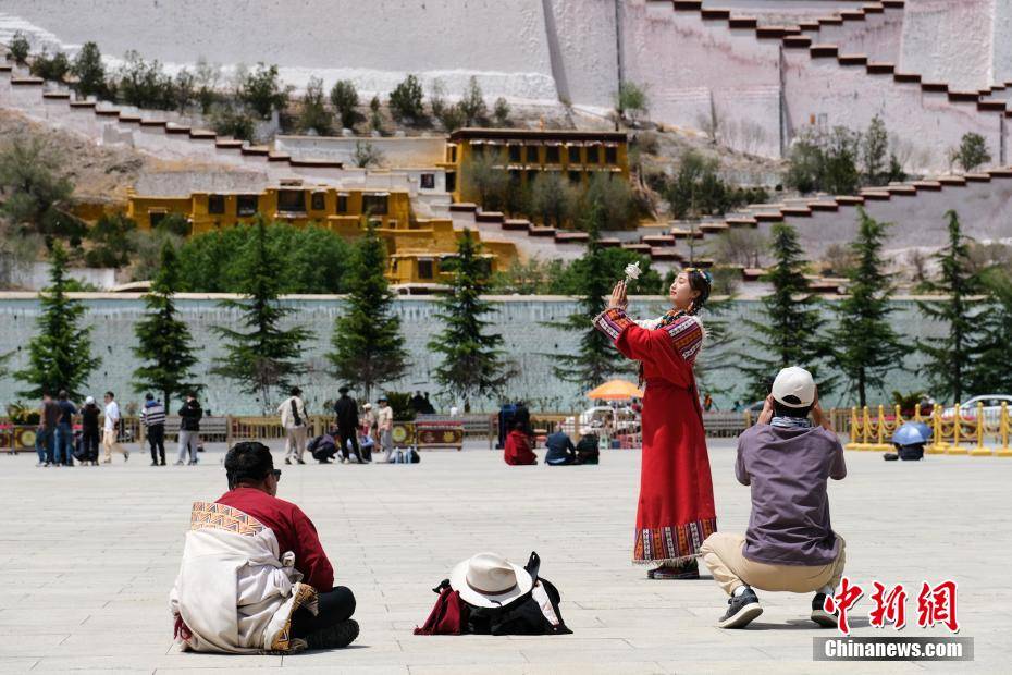 5月31日,游客在布达拉宫广场拍摄藏装写真。