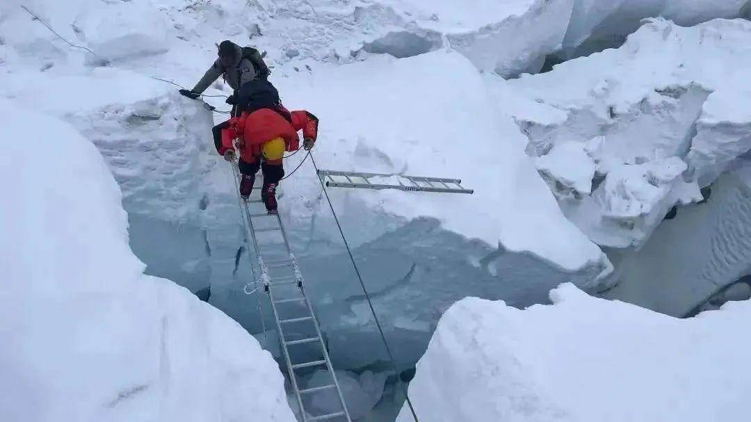 在当地向导的带领下,李永生一行人身穿厚厚的登山服,背着行囊、冰镐、氧气瓶、绳索和补给品,开始进发。在昆布冰川,大家一边感慨大自然的鬼斧神工,一边小心翼翼地前行。遇到巨大的裂缝,向导指挥搭建梯子,队员们挨个通过。下方就是宽大而深不可测的冰缝,一旦掉入,生还希望十分渺茫。